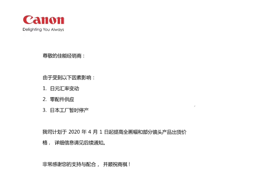 近日,第三方泄露出一份佳能的经销商公告,由于受到日元汇率变动,零配件供应以及日本工厂暂时停产三方面原因的影响,佳能将于2020年4月1日起提高全画幅和部分镜头产品的出货价格,并将会在后续出台价格调节的详细信息。