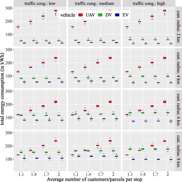 模拟数据表明,在人口稠密的城市地区,电动火车依然是迄今为止最节能环保的送货方式。此时柴油货车的能耗约是其五倍,无人机的能耗则是它的十倍左右。