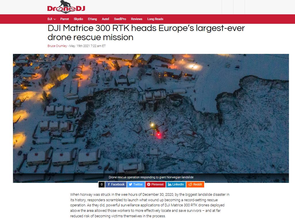 国外无人机资讯网站DroneDJ 5月19日称,在去年底的挪威山体滑坡发生后,大疆经纬300 RTK无人机领导了欧洲有史以来最大规模、最长时间的无人机救援任务。