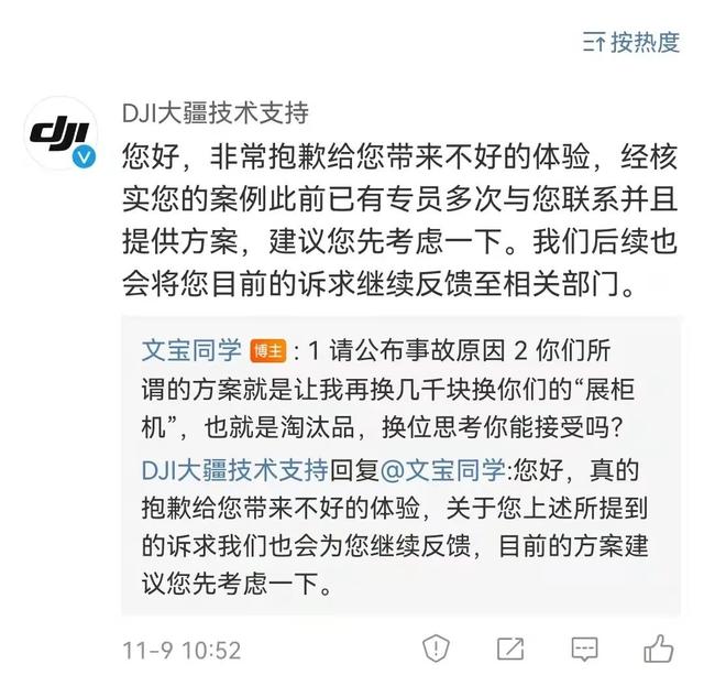 “在我的坚持和追问下,大疆客服只能承认因为机器失联,他们的技术人员也分析不出本次失联的事故原因,愿意提供折扣购机服务。”谭先生表示,从一开始的九折购机到最后的五折购机,大疆客服一直在提供解决方案。“但是因为机器停产,五折购机也不能提供新机,只能提供展柜机(也就是库存的样品机),大疆所谓的五折购机优惠,也就是让我再花几千块钱去买台已经停产的、摆放在展柜里的展示机,这一点我无论如何不能接受。”谭先生说。