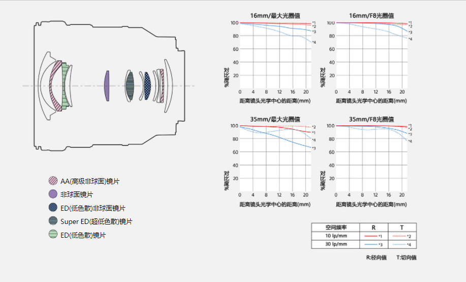 据介绍,镜头包含2枚高级非球面镜片(AA)、1枚非球面镜片、一枚 SuperED(超低色散)和一枚ED(低色散)玻璃镜片,以及1枚ED(低色散)非球面镜片,可同时有效控制色差和球面像差,在整个成像区域和16-35mm变焦范围内提供出色的光学性能。