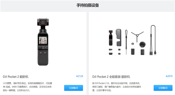 DJI Pocket2全能套装翻新机2979元,全新价3499元,便宜520元;
