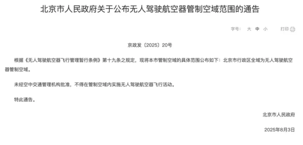 2025年8月3日北京市人民政府发布《北京市人民政府关于公布无人驾驶航空器管制空域范围的通告》,北京市行政区全域为无人驾驶航空器管制空域。无人机使用者都需要在无人驾驶航空器综合管理平台(以下简称UOM平台:https://uom.caac.gov.cn)先行注册并查询适飞空域。