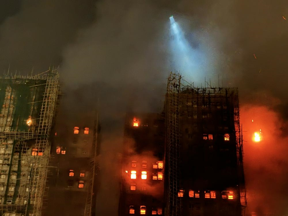 今日凌晨1时,财联社记者在香港大埔火灾事故现场发现,夜空中有多架无人机在火场上方盘旋。现场一名警务人员向记者确认,消防处及警方调用的无人机主要用于火场侦察与辅助照明。