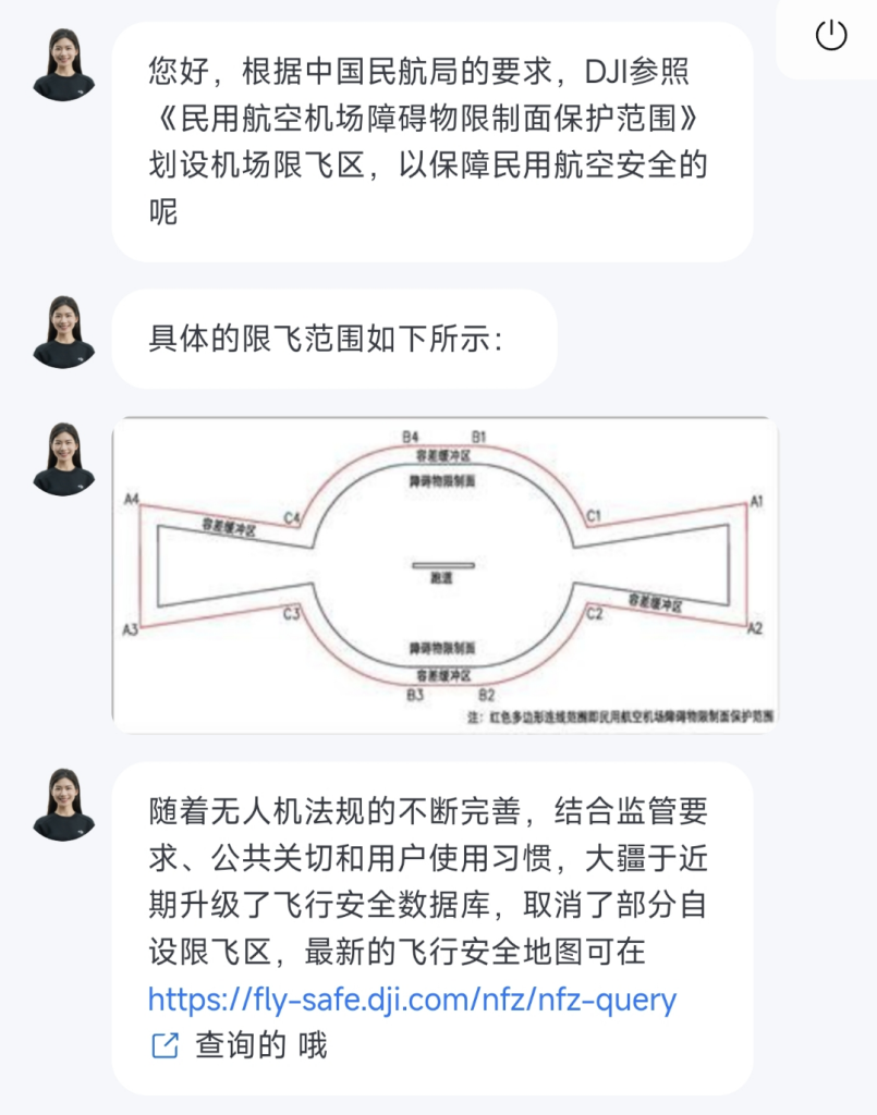 据了解,调整前大疆GEO系统在机场禁飞区外围设置了120米限高区,具体范围为以机场跑道正中点为圆心、半径10公里的圆形区域内,与禁飞区、30米及60米限飞区不重叠的部分,统一实施120米飞行高度限制。而2024年1月1日起施行的《无人驾驶航空器飞行管理暂行条例》明确规定,轻型无人机在视距内飞行的高度不得超过120米,这一法规要求与大疆原自设限高存在功能重叠,此次调整实现了企业安全管理与国家法规的精准对接。