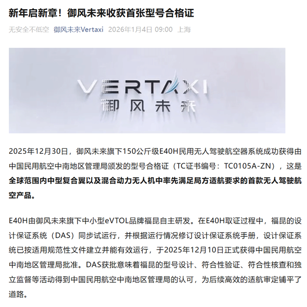 1月4日消息,御风未来官方宣布,2025年12月30日,御风未来旗下150公斤级E40H民用无人驾驶航空器系统,成功获得由中国民用航空中南地区管理局颁发的型号合格证(TC证书编号:TC0105A-ZN)。