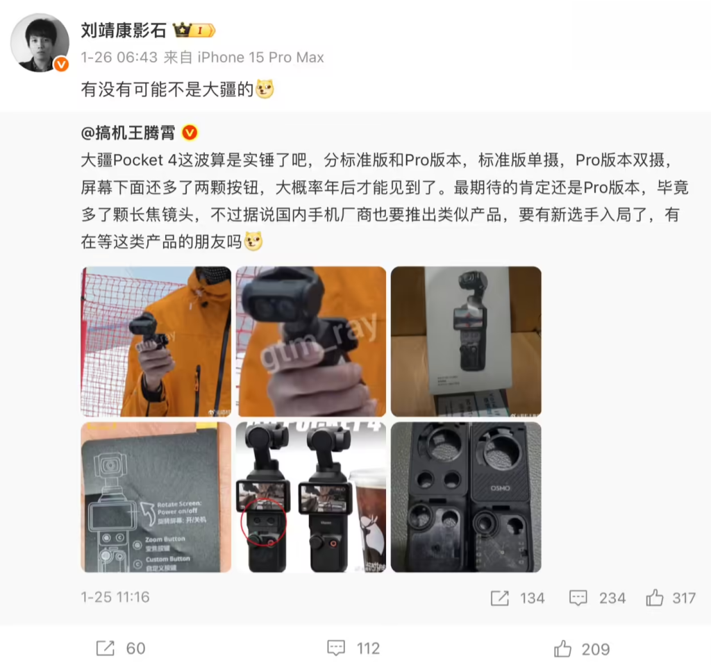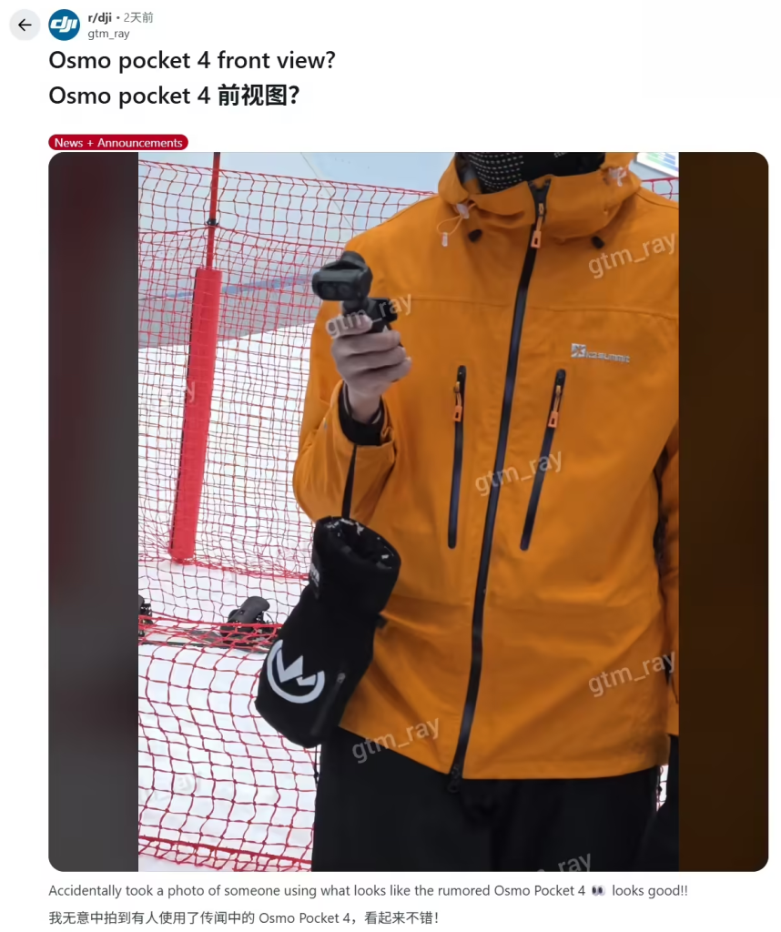 上个月末,消息人士 gtm_ray 在 Reddit 论坛曝光一款手持云台相机,据称是大疆尚未发布的 Osmo Pocket 4 Pro。影石创始人刘靖康转发了相关微博,并称“有没有可能不是大疆的”。