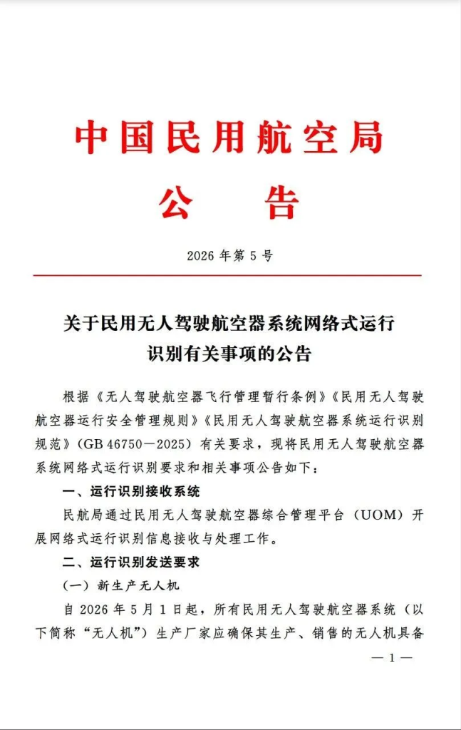 从《公告》获悉,自 2026 年 5 月 1 日起,所有民用无人驾驶航空器系统生产厂家应确保其生产、销售的无人机具备运行识别发送功能且技术规范完全符合 GB46750-2025 的要求。运行识别信息由无人机直接向 UOM 发送,无人机应在依靠自身动力飞行的全过程中保持运行识别信息的自动持续发送,且不应具备关闭发送的功能。对于 2026 年 5 月 1 日之前已销售的无人机,生产厂家应当按相关要求进行升级改造。