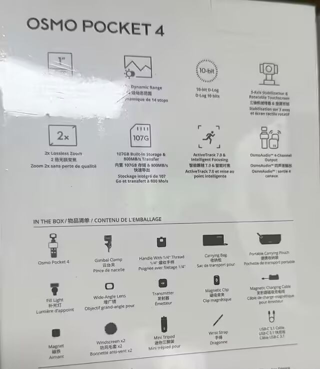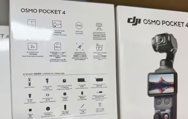 4 月 5 日消息,网上现已流出大疆 Osmo Pocket 4 全能套装官方零售包装的首批高清照片,清晰地展示了产品的外观,包装背面还印有全部核心规格参数,证实了这款即将发布相机的主要配置:搭载 1 英寸传感器、14 档动态范围、107GB 内置存储,传输速度高达 800MB/s,支持 2 倍无损变焦,还配备全套面向创作者的配件。