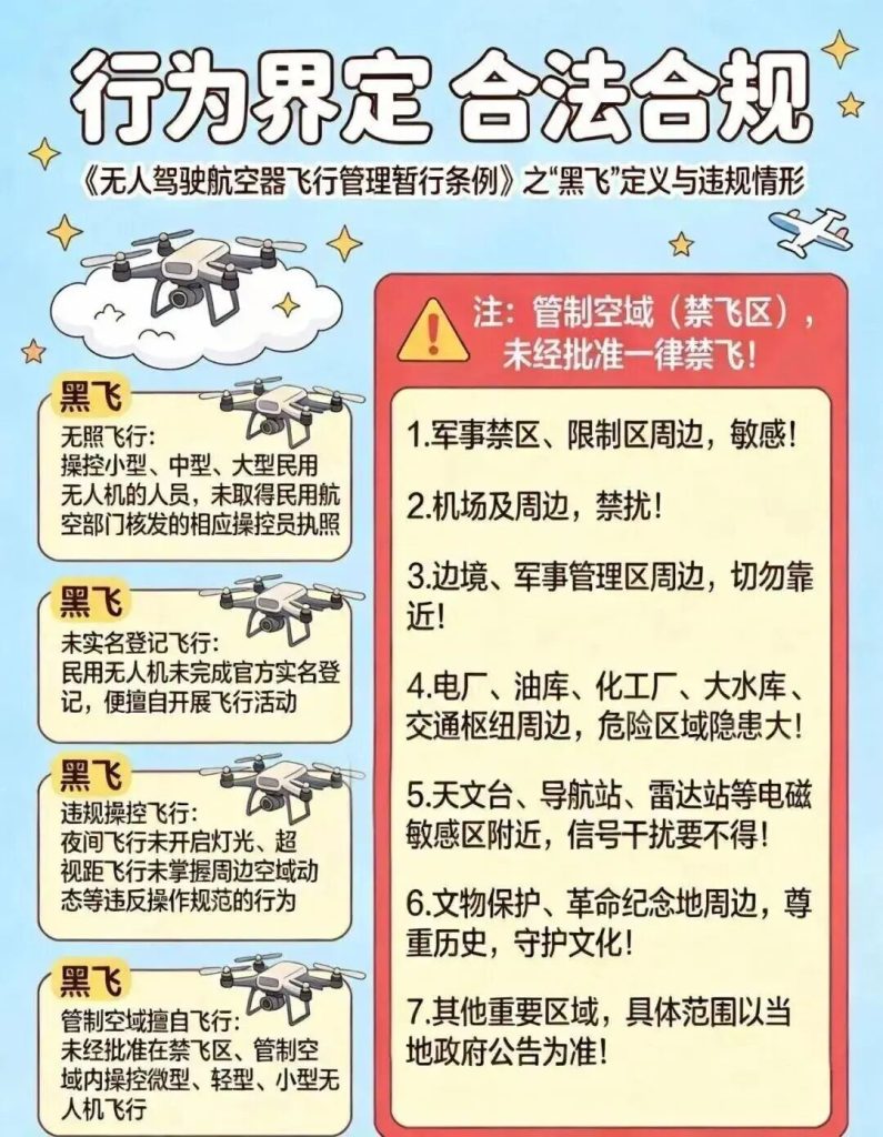 如果“黑飞”行为危害公共安全,造成严重后果(如导致航班备降、重大财产损失或人员伤亡),可能构成 “以危险方法危害公共安全罪” ,最高可判处死刑。非法拍摄军事设施则可能构成 “非法获取国家秘密罪” 。