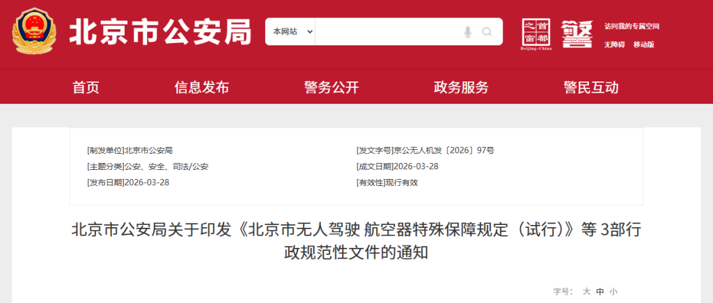 3月27日,北京市公安局为确保《北京市无人驾驶航空器管理规定》有效落地落实,研究制定《北京市无人驾驶航空器特殊保障规定(试行)》《北京市无人驾驶航空器存储场所管理规定(试行)》《北京市无人驾驶航空器信息核实办法(试行)》3部行政规范性文件,自2026年5月1日起实施。