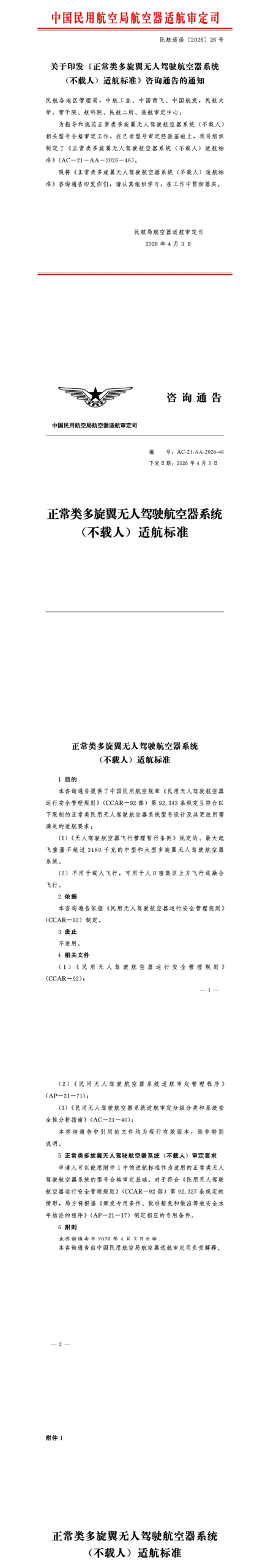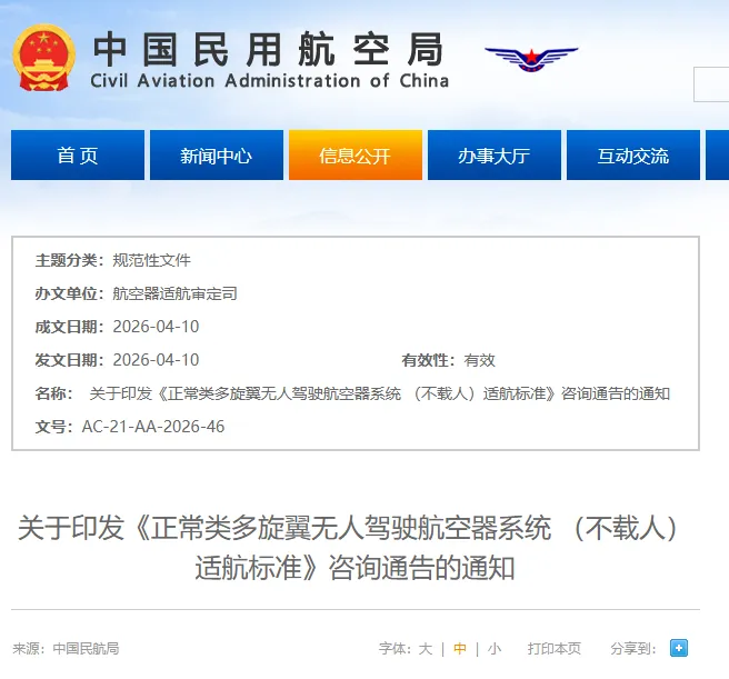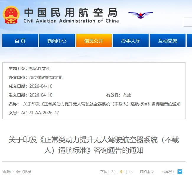 4月10日,民航局正式发布了《正常类动力提升无人驾驶航空器系统(不载人)适航标准》(AC-21-AA-2026-47)《正常类多旋翼无人驾驶航空器系统 (不载人)适航标准》(AC-21-AA-2026-46)两部全新适航标准。两部标准已自2026年4月3日起正式生效。其中,《正常类动力提升无人驾驶航空器系统(不载人)适航标准》为最大审定起飞重量为25公斤以上、5700公斤及以下,不用于载人飞行的、可进行融合飞行或者在人口密集区域上方飞行的正常类动力提升无人驾驶航空器系统提供了一种局方可接受的适航标准,这类航空器的飞行形态包括多旋翼形态、固定翼形态和过渡形态。