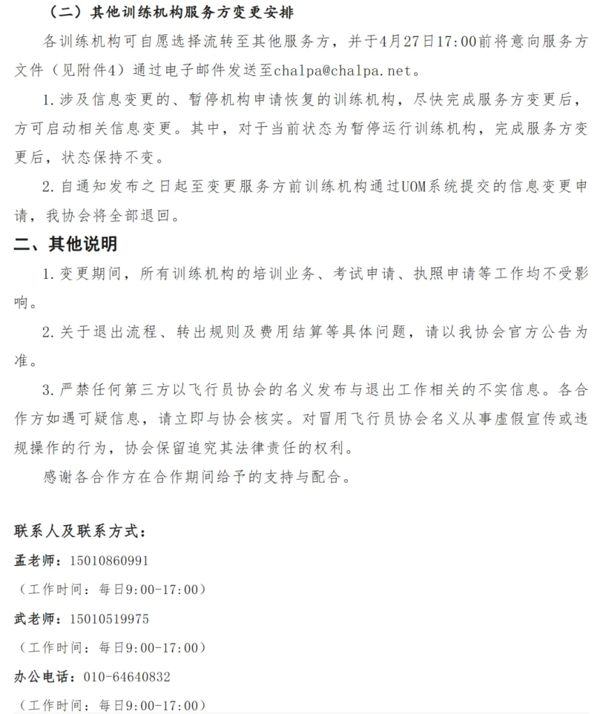 2.机构选择:原飞协合作的训练机构需自愿选择并流转至剩余三家官方服务方,且必须在截止日期前提交书面意向至飞协指定邮箱。