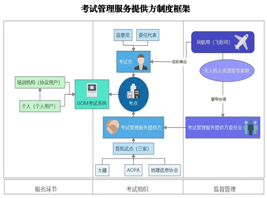 获批准的服务方设置的考点采取清单制向公众公布并由飞标司管理,考试员由飞标司直接聘任和解聘。考点负责处理个人用户报名并提供相应咨询服务,协助协议报名用户对接UOM考试系统,在服务方的监督和支持下具体组织实施考试,包括场地和空域协调、维护考试秩序和协助处理违规情况等。