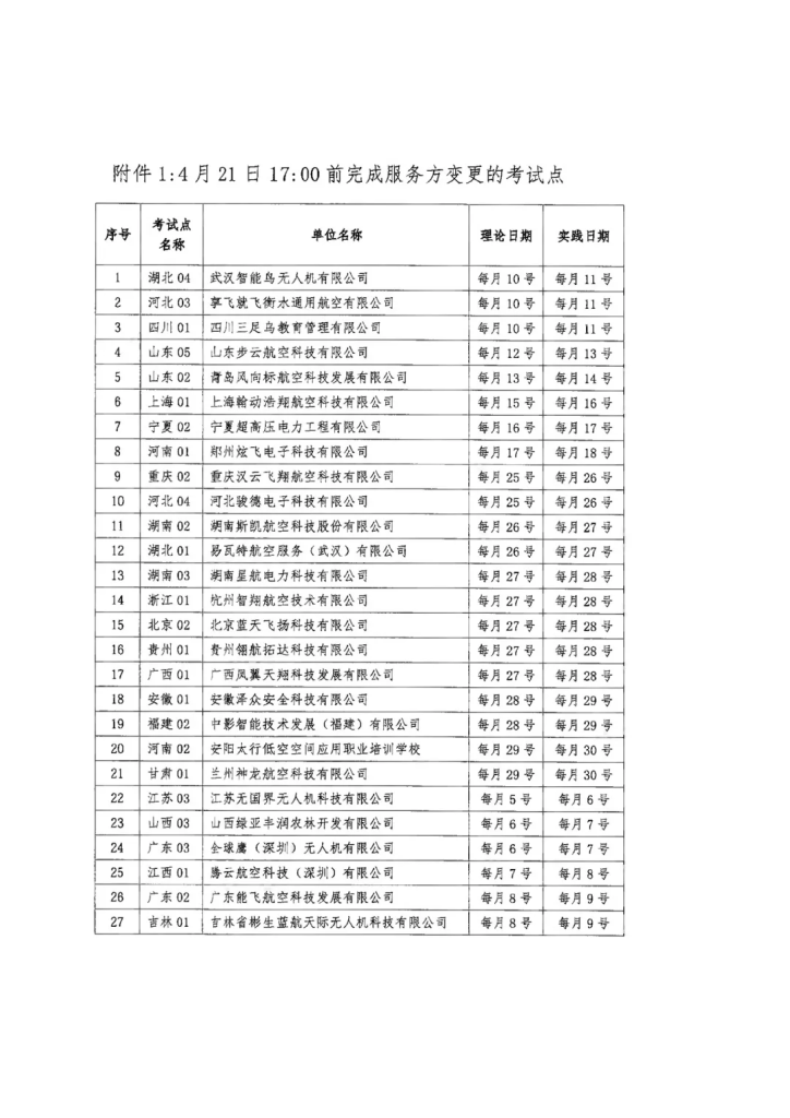 - 4 月 21 日 – 27 日:各考试点、委任代表和训练机构分批完成服务方变更。