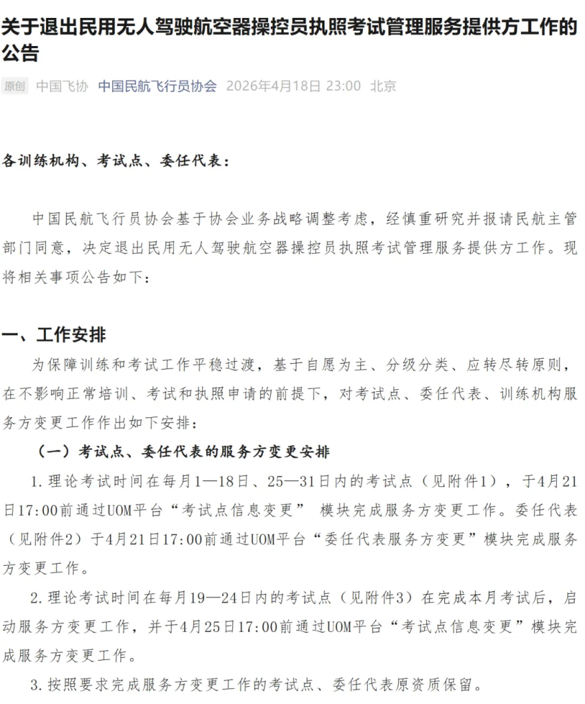 中国民航飞行员协会昨日晚间发布公告,宣布退出民用无人驾驶航空器操控员执照考试管理服务提供方工作。此前通过飞协申请资质的无人机训练机构可以自愿选择流转至其他服务方,于4月27日17:00前将意向服务方文件(见附件4)通过电子邮件发送至chalpa@chalpa.net。这是继 2025 年 5 月大疆创新(UTC)退出后,行业考试服务格局的第二次重大变动,标志着无人机执照培训与考试体系正式进入 “三足鼎立” 的新阶段。对于全国数千家无人机培训机构而言,这不仅是一次服务方的变更,更是关乎生存与发展的关键抉择。